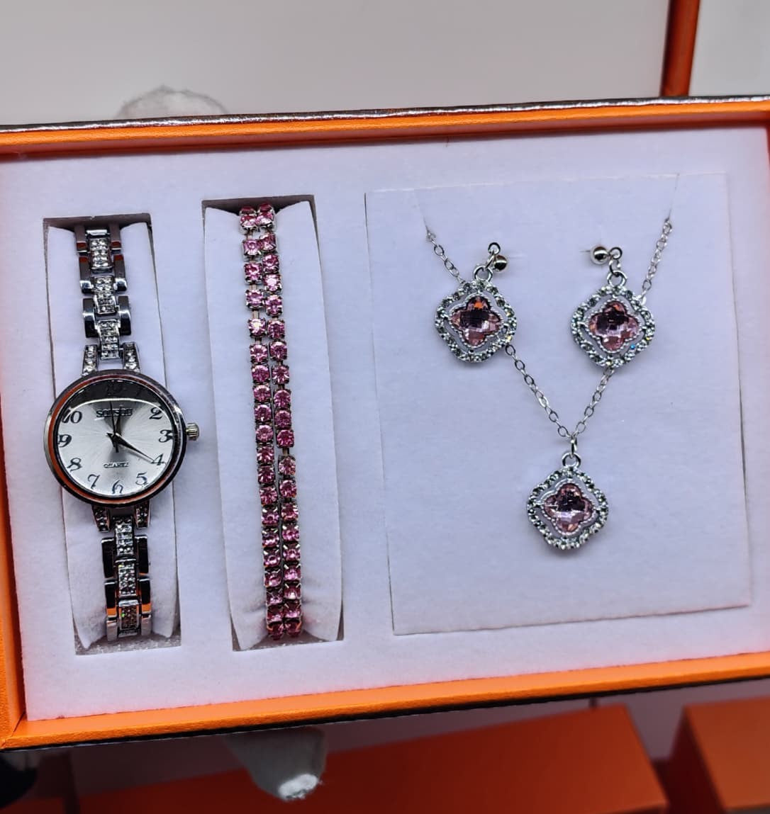 Dəstə saat, bilərzik, sırğa və boyunbağıdan ibarət zərgərlik dəstdir