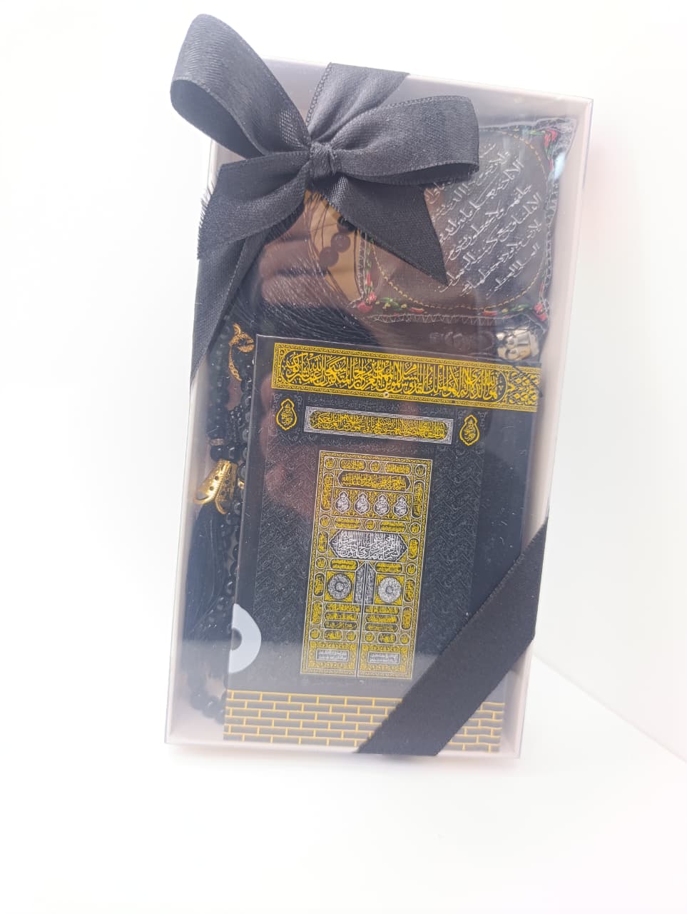 Şəffaf qutuda Kəbə təsvirli kiçik Quran kitabı və təsbeh dəsti təqdim olunur