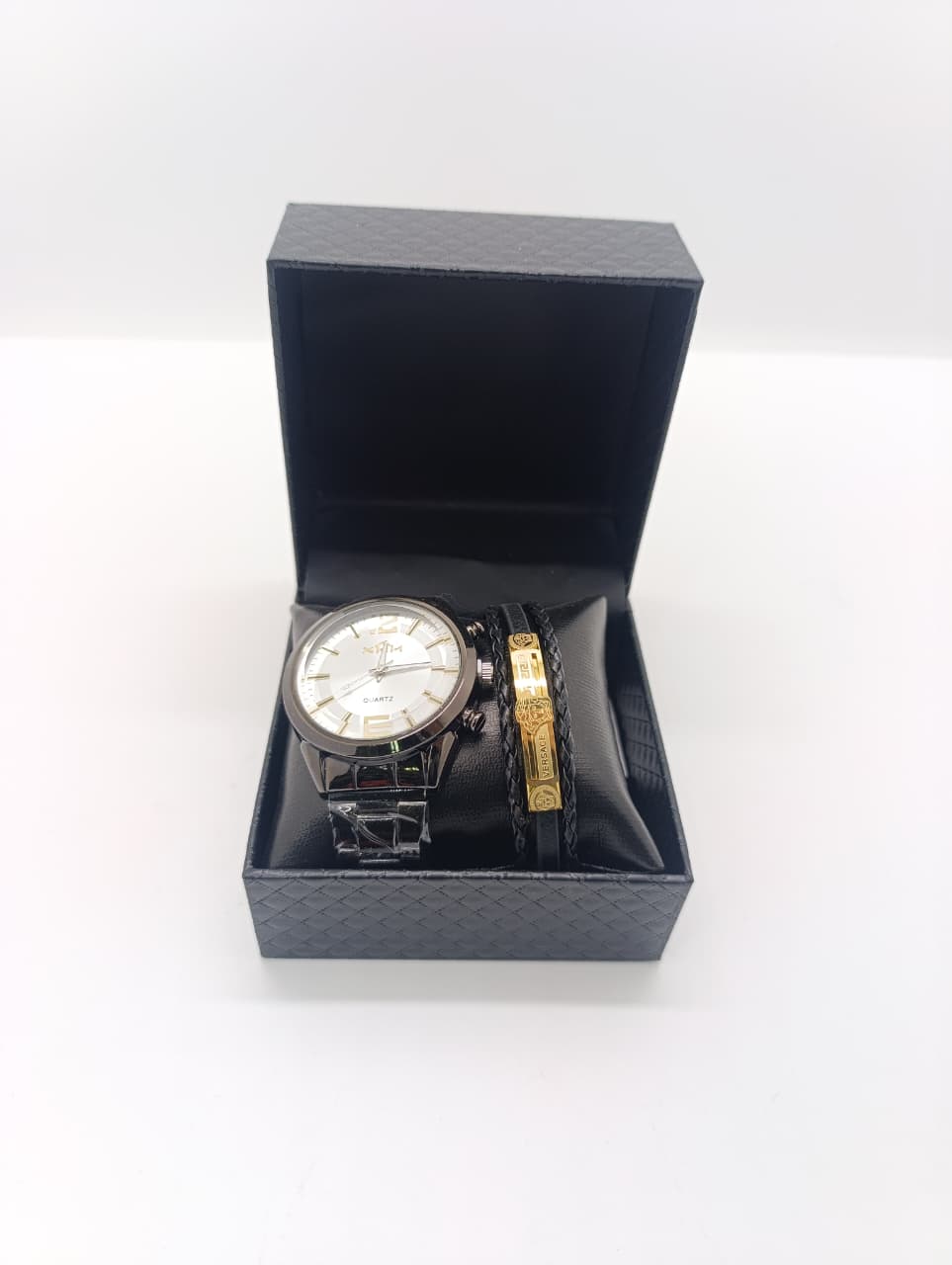Qara rəngli qutuya qoyulmuş saat və Qolbaq dəsti
