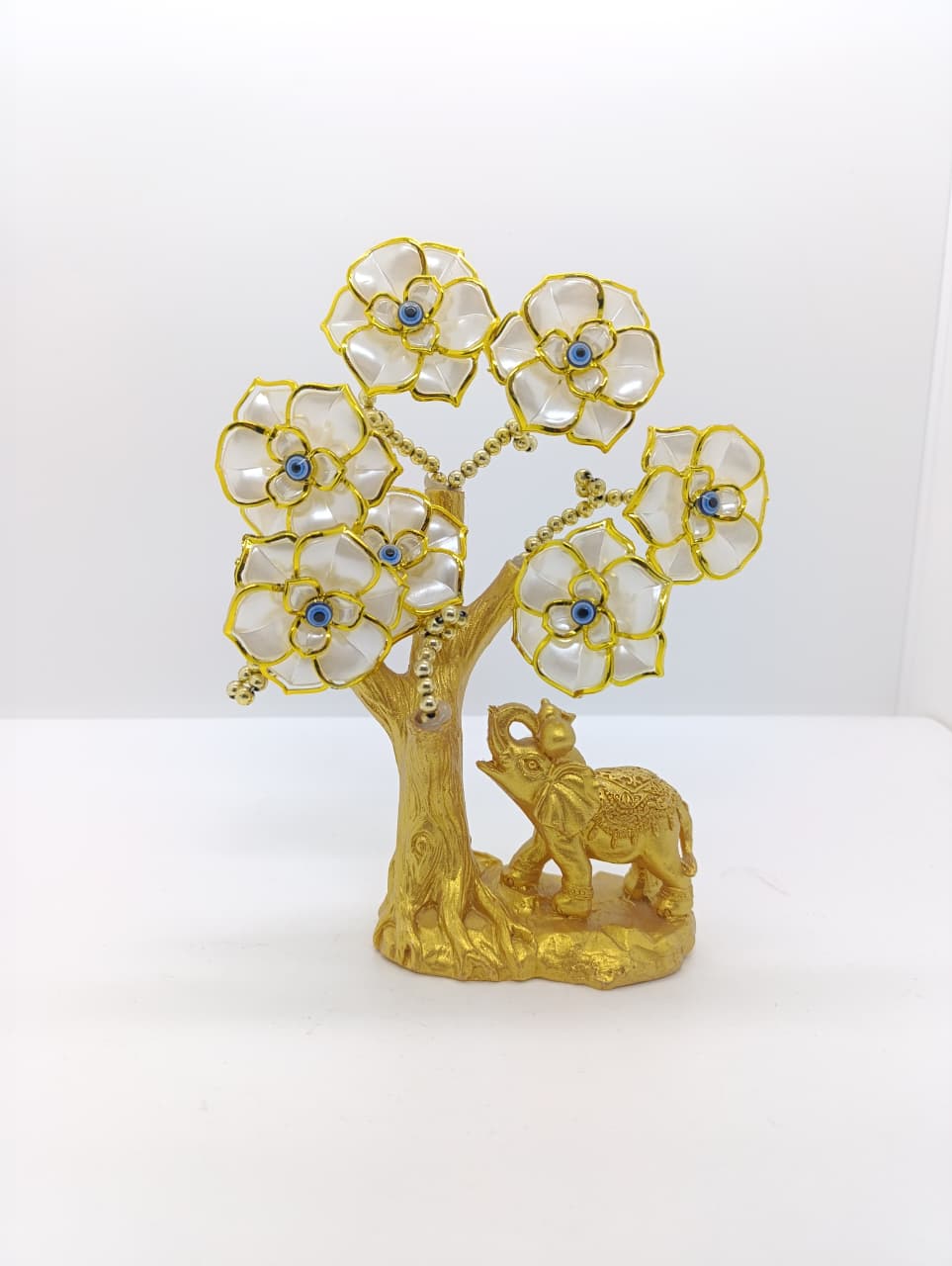 Bəzəkli metal gövdəli,fil fiqurlu və muncuqlarla bəzədilmiş ağ çiçəkli bəxt ağacıdır
