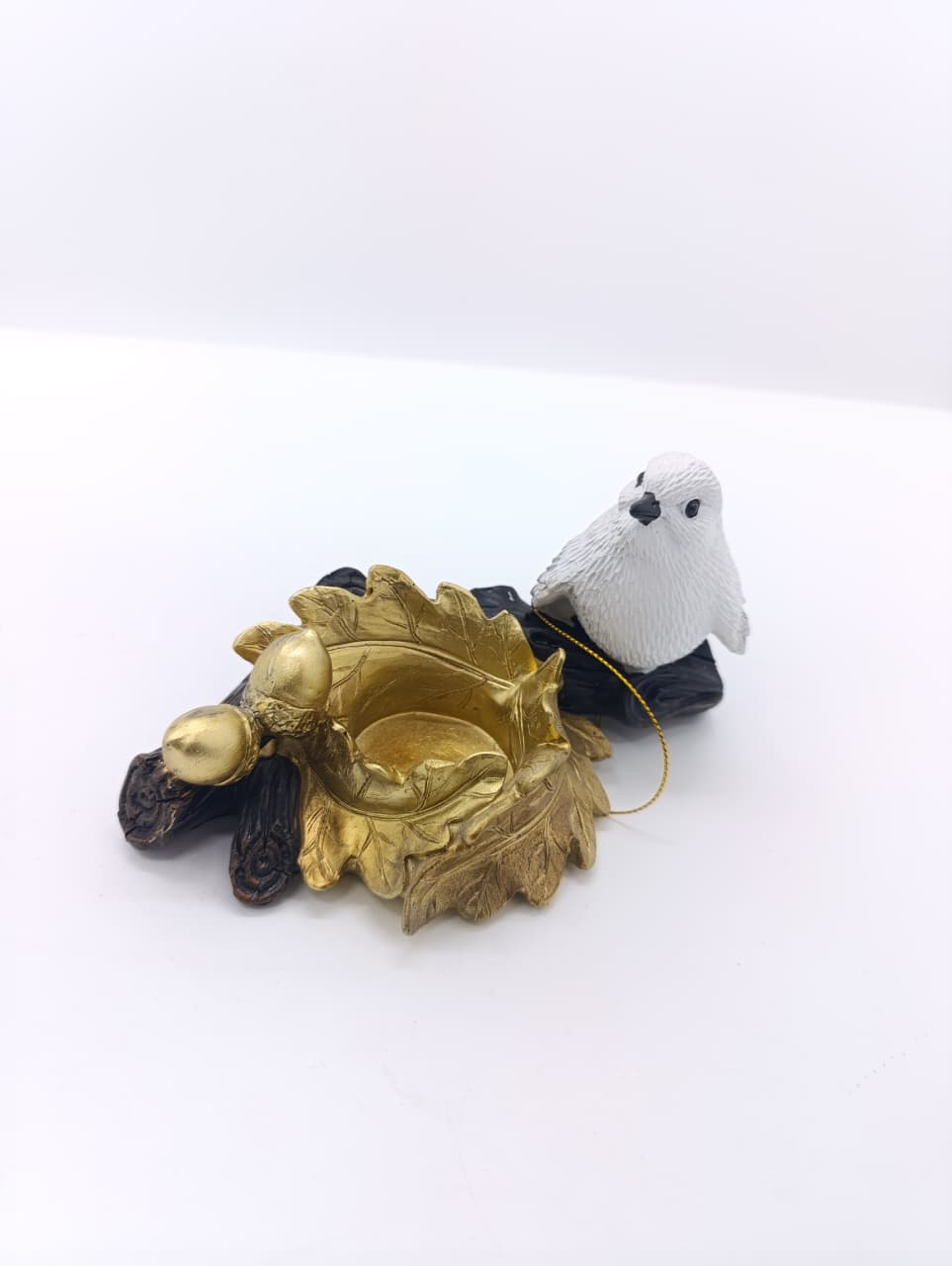 Palıd yarpaqları və qozaları ilə bəzədilmiş ,kiçik ağ quş fiquru olan dekorativ şamdan