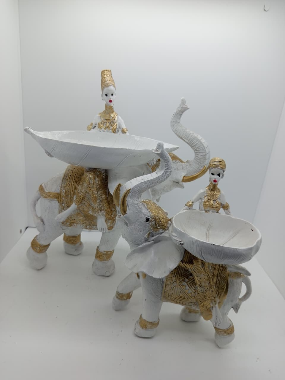 Ağ və qızılı rəngli, üzərində fiqurlar olan fil formalı bəzəkli meyvə qabıdır
