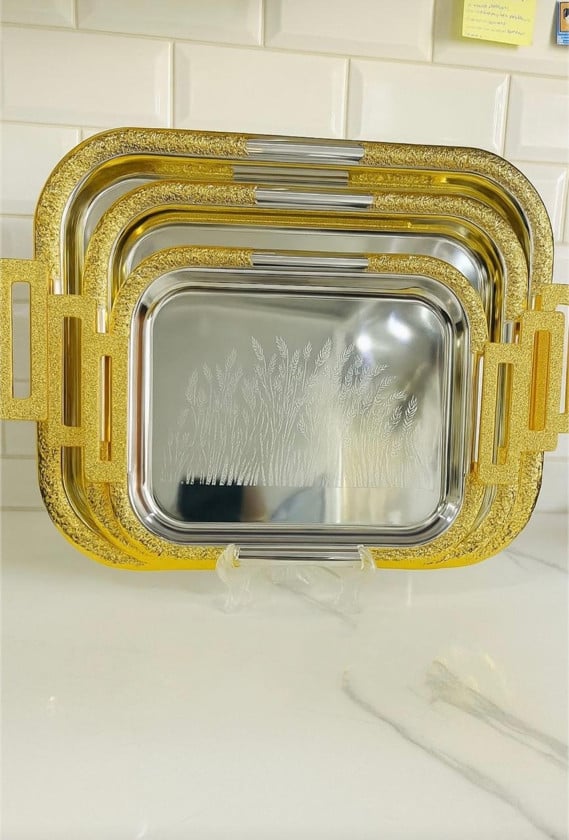 Qızılı qulpları olan gümüşü/qızılı, üç hissəli sini dəstidir